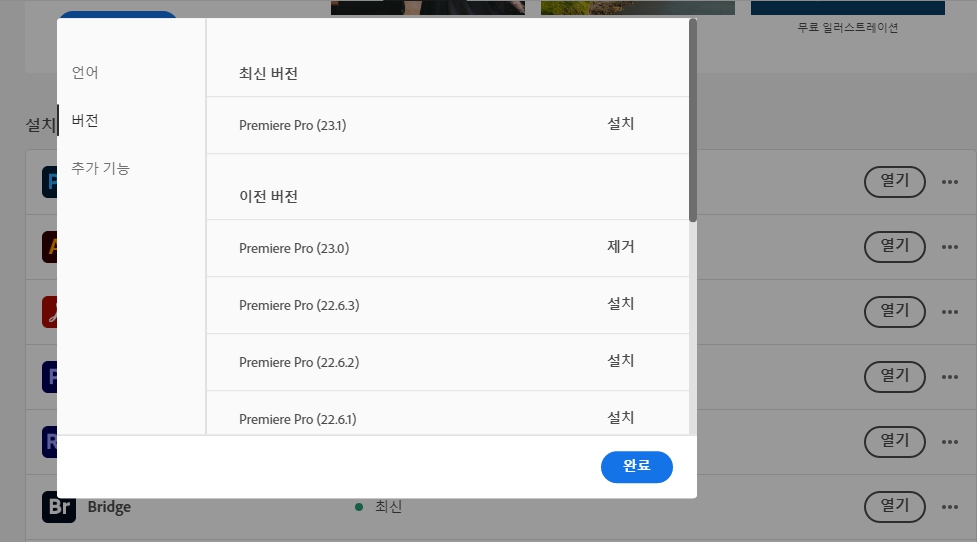 기타 버전을 누르면 프리미어프로의 그동안의 버전 리스트를 확인하실 수 있어요.