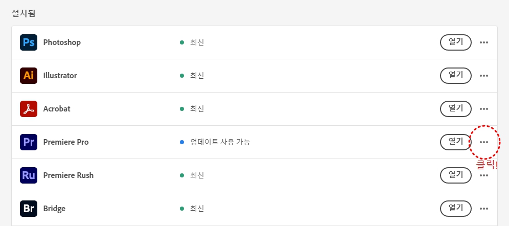 어도비 클라우드를 실행하여 프리미어프로그램 우측 점 세 개가 보이는 부분을 클릭하면