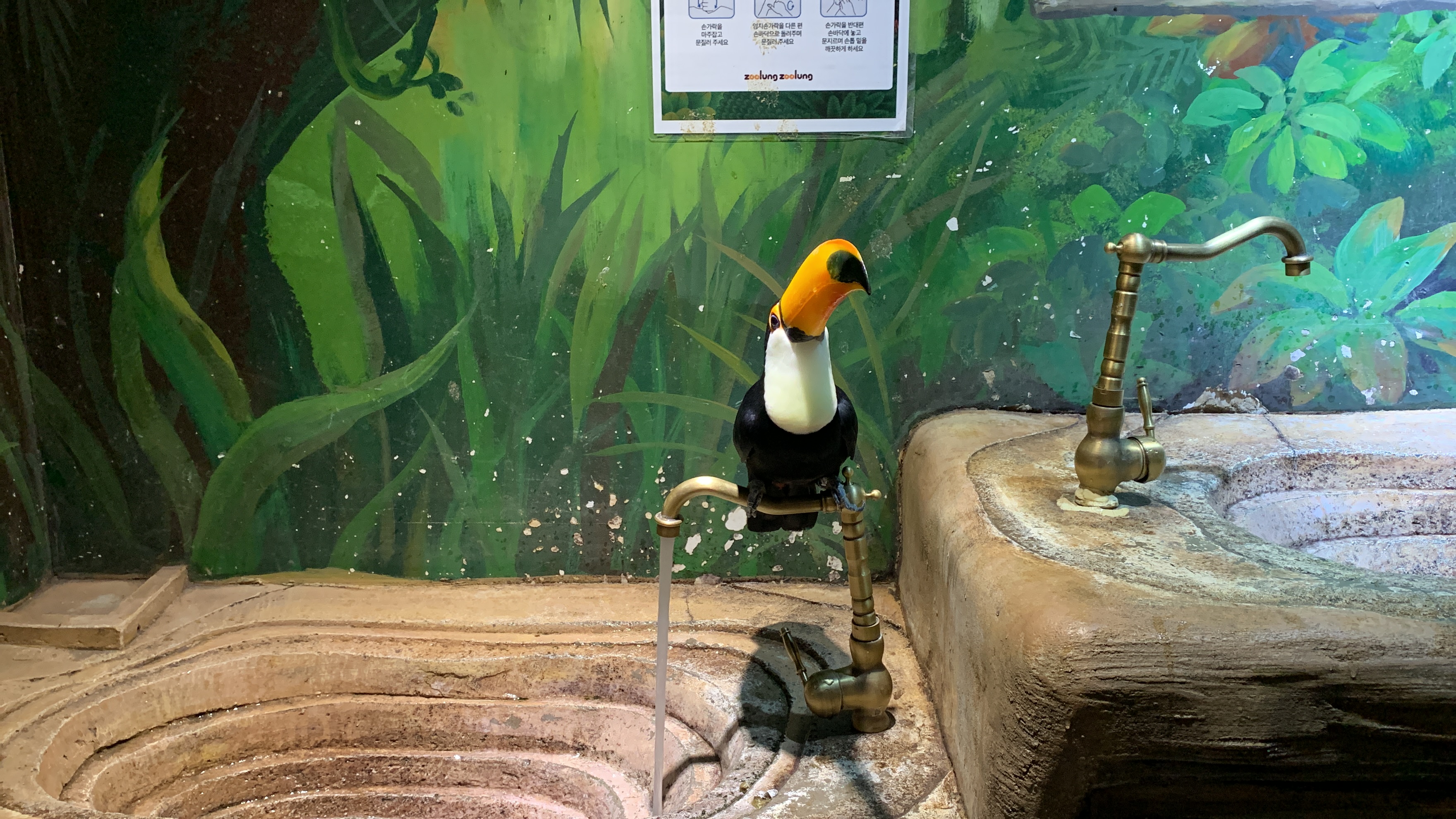심지어 어느 아이가 손을 씻고 나니 토코투칸 한 마리가 수전 위로 날아와 앉은 뒤