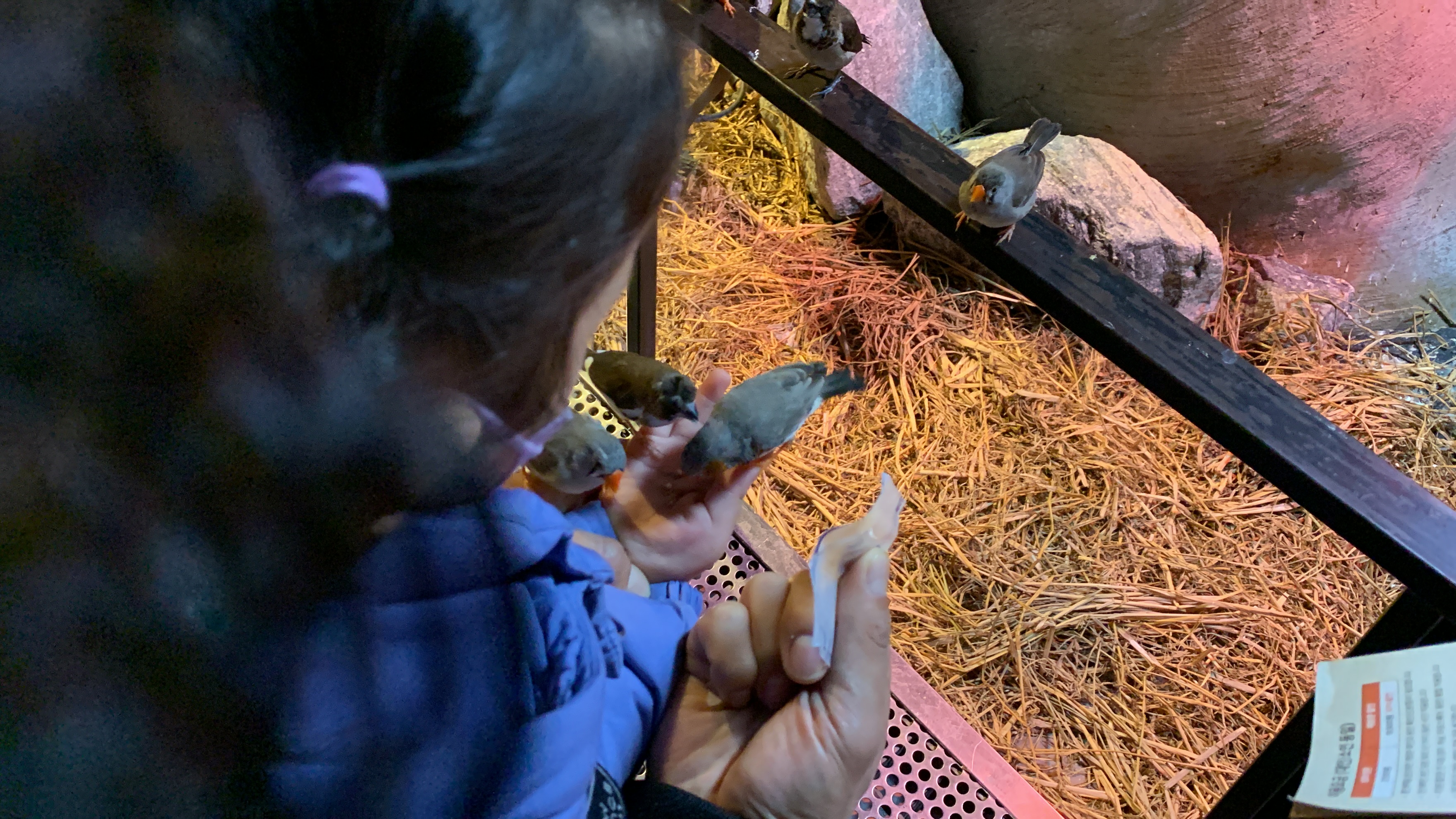 아이의 손만큼 작은 새들이 손위에 앉아 모이를 먹는 것을 보고