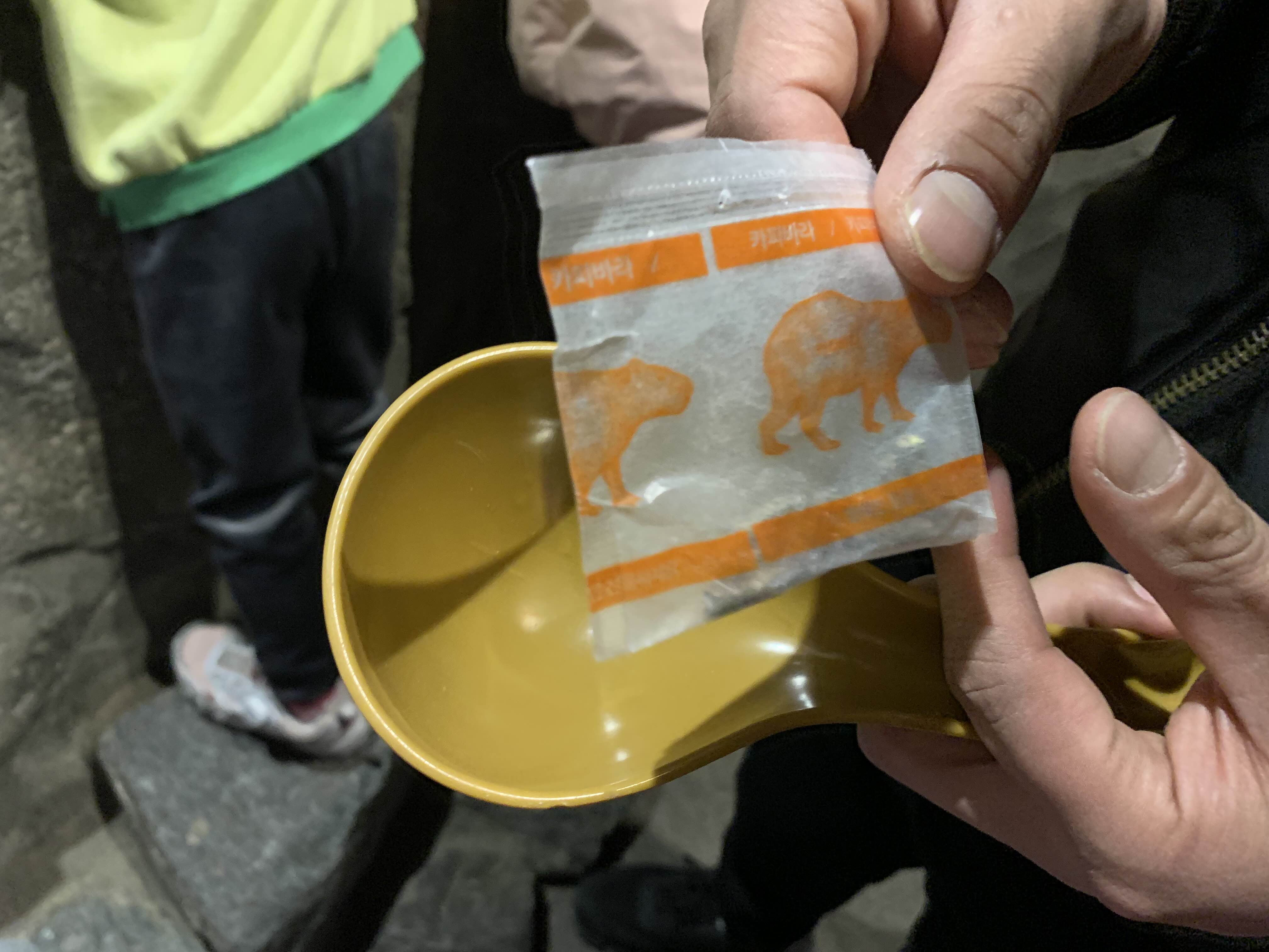 좀 전에 낯가리는 카피바라에게 줄 수 없었던 사료를