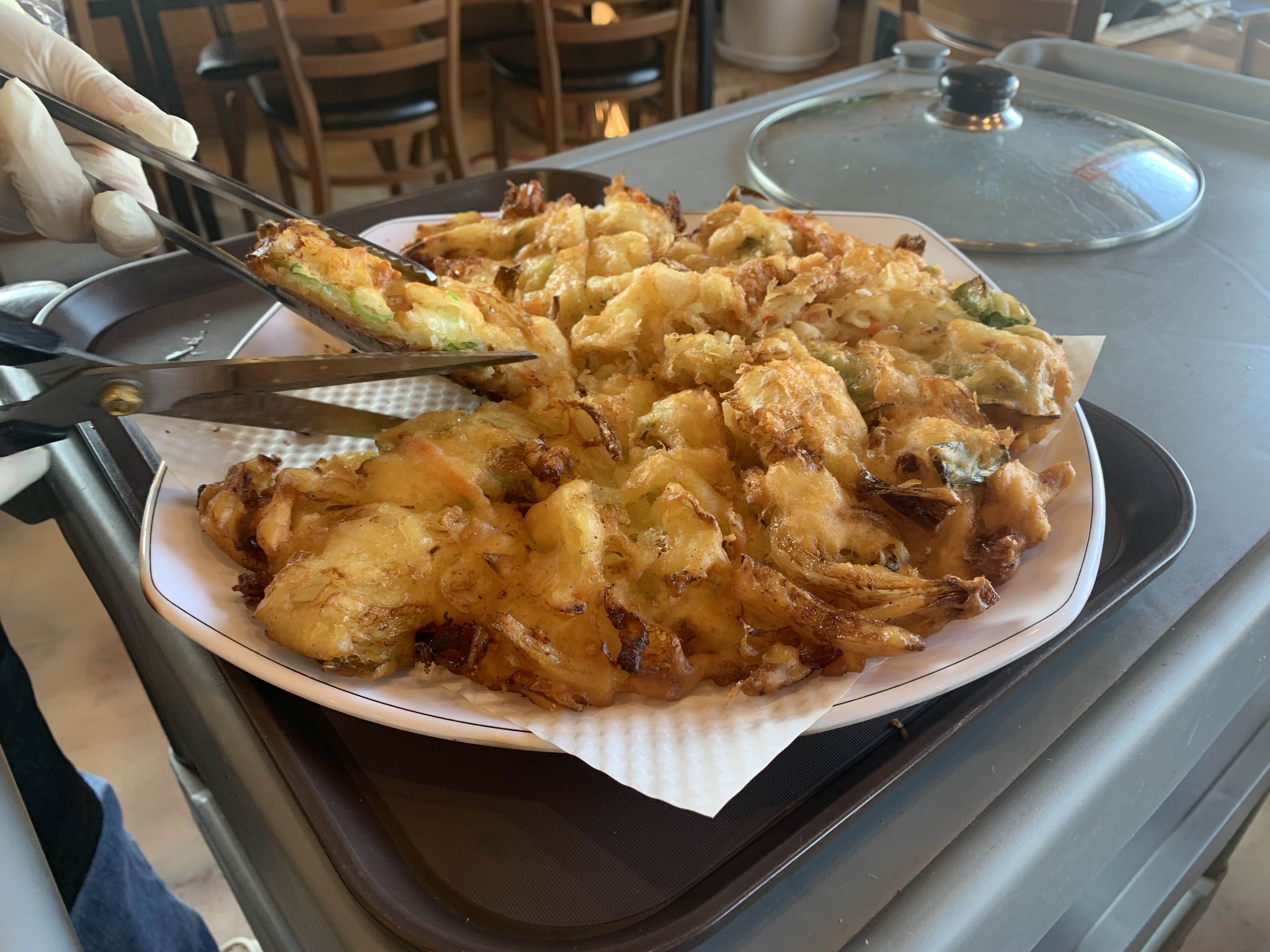 해물튀김파전은 야채와 해물이 가득들어있고 두께가 두꺼움에도 바삭하게 튀겨진 파전입니다.