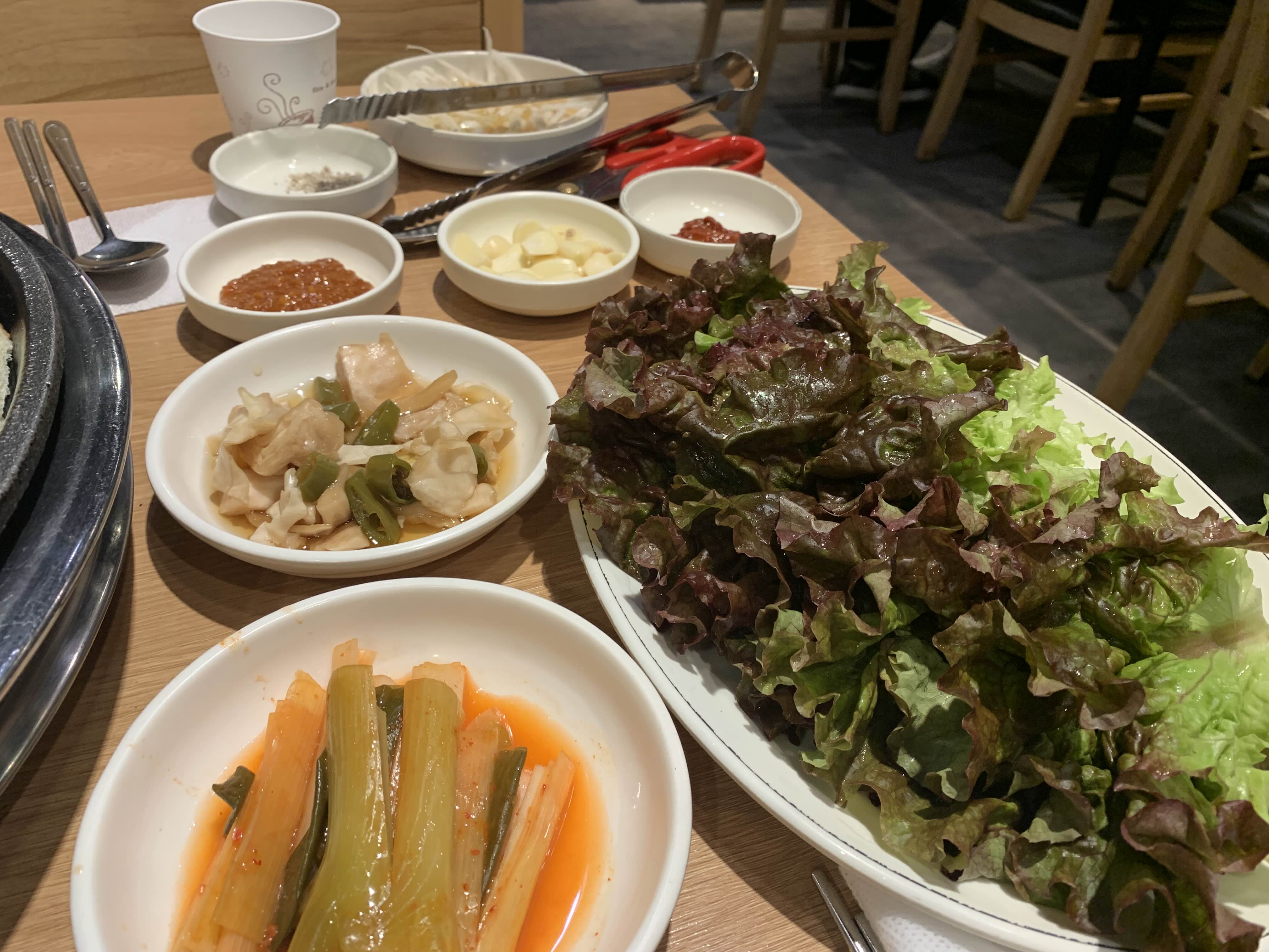 양배추 샐러드, 파절임, 양배추고추절임, 마늘, 상추, 김치 등등