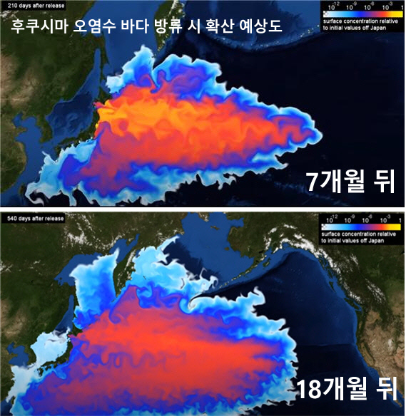후쿠시마 원전 방사능 오염수를 바다에 방류하기 시작하면 수심 200m 이하에 위치한 오염수는 구로시오 난류를 통해 태평양으로 흘러간다고 합니다. 바다에 흘러간 오염수는 북태평양 난류를 만나 미국 캘리포니아 해협까지 도달하게 되고, 오염수는 다시 북적도 해류로 이동하며 구로시오 해류와 만나게 될 것이라고 예상됩니다.